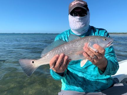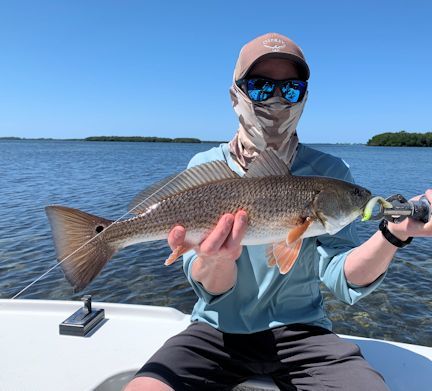 You might find reds in potholes or along the edges of flats and bars on negative low tides. They may also tail on shallow grass when the tide is low. CAL jigs with shad tails and 4” jerk worms, DOA Shrimp and lightly weighted flies with weed guards will work well in that situation. As the tide rises, reds will spread out and feed on shallow flats. I usually let the stage of the tide tell me where to look for reds. When it is low they may be found in potholes or on the outer edges of shallow flats, moving closer to the shoreline as the tide rises. You may also find them around docks this month.